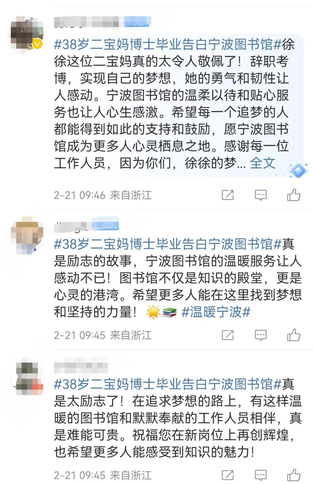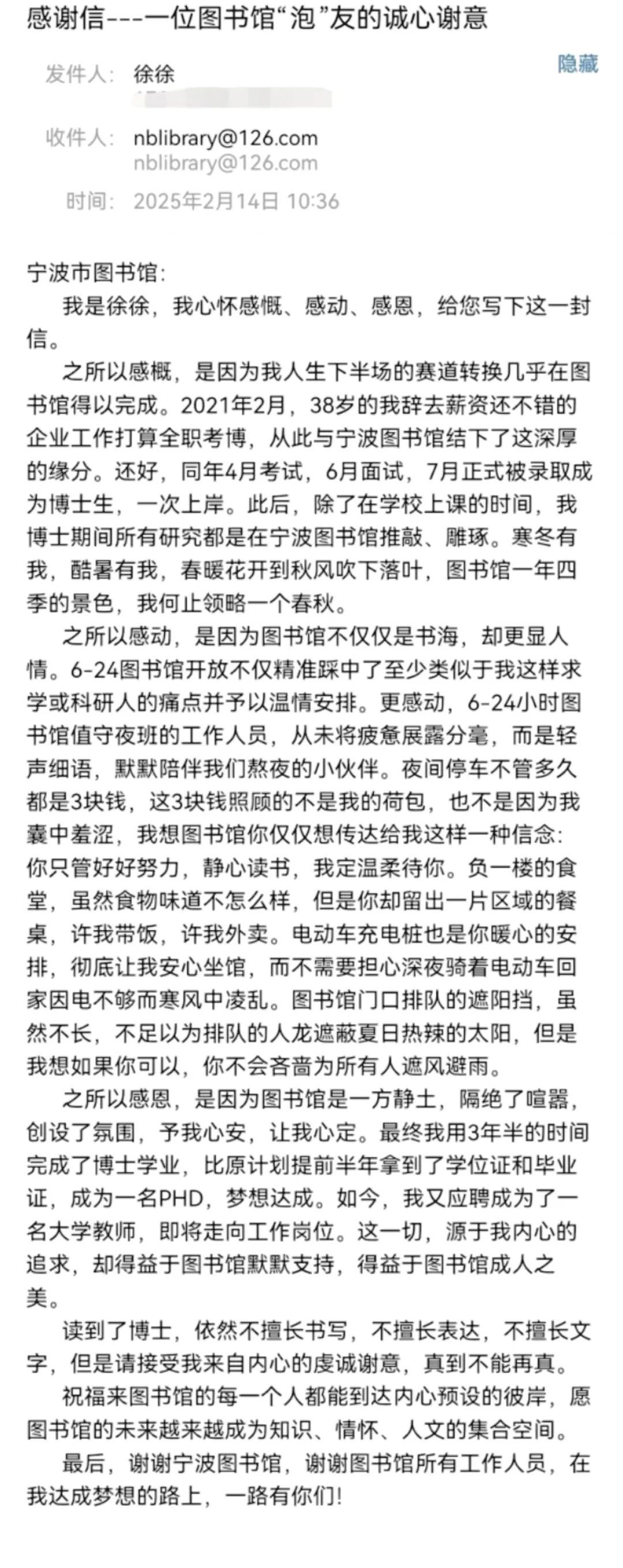 前几天,宁波图书馆的读者邮箱收到一封“告白信”。信是一位叫“徐徐”的读者写的,信中回溯了她从2021年2月辞职考博,直至2024年12月博士毕业的经历,“除了在校上课,我博士期间所有研究都是在宁波图书馆精心推敲、雕琢……”