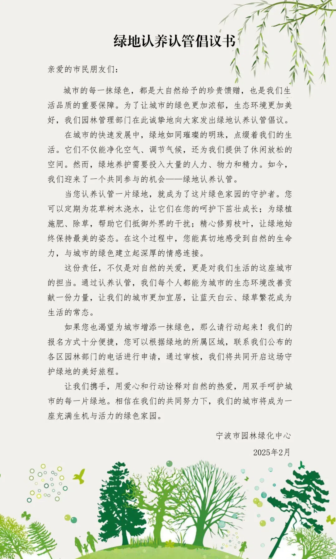 有意愿认建认养认管的单位和个人请尽快与属地园林绿化管理部门或市园林绿化中心联系。