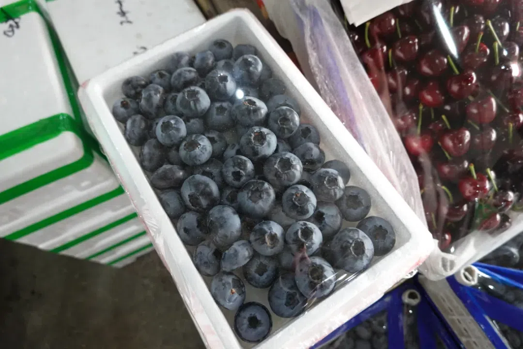 4005号摊位卖的主要是产自辽宁丹东的蓝莓。记者在摊位上看到,辽宁丹东蓝莓的包装分为泡沫箱和筐装两种。其中,0.5公斤装、果径比1元硬币还大的蓝莓,目前售价仅70元;4公斤装的蓝莓,每公斤批发价低至90元。