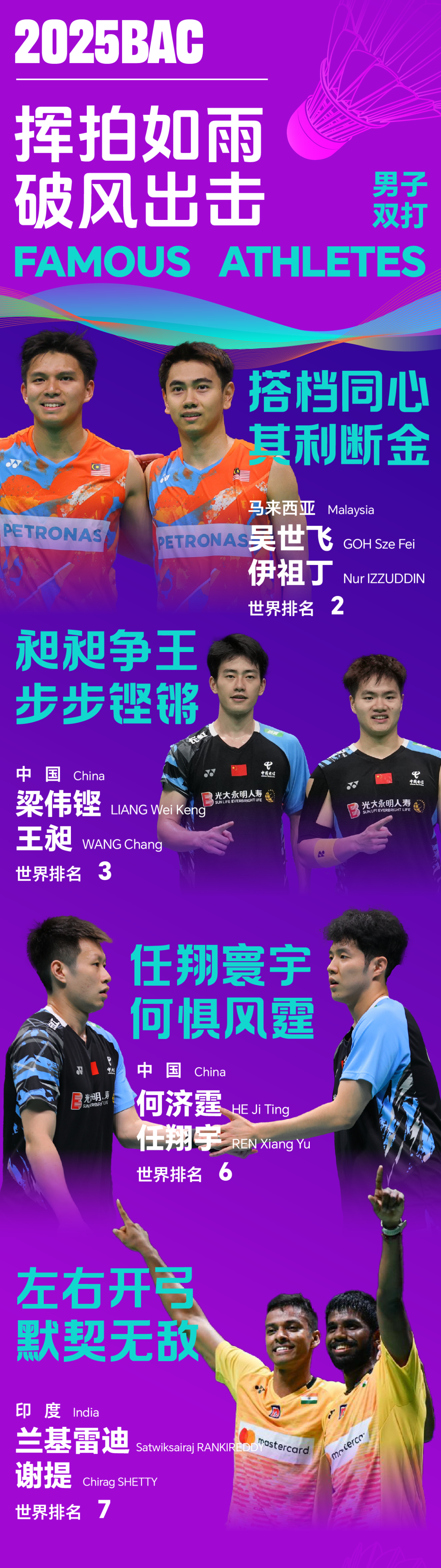 男双阵容将由宁波选手王昶和搭档梁伟铿领衔,去年梁伟铿/王昶在宁波折桂。“梁王”组合的决赛对手、世界排名第二的马来西亚组合吴世飞/伊祖丁也将披挂上阵。同时,中国组合何济霆/任翔宇,印度组合兰基雷迪/谢提也会继续参赛。