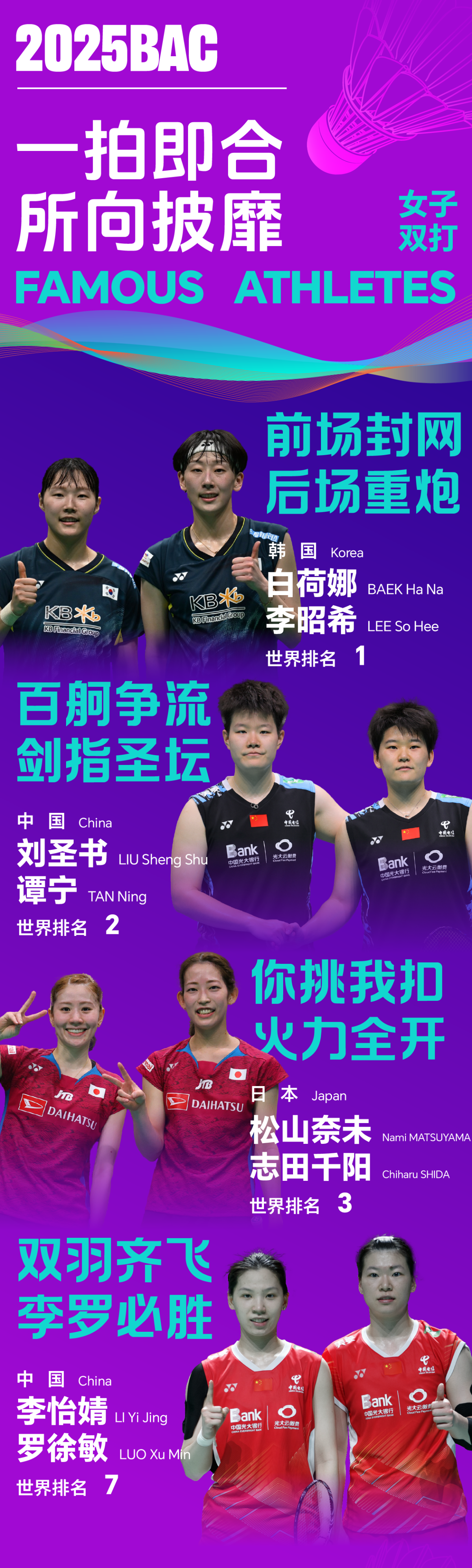 女双方面,世界排名第一的韩国组合白荷娜/李昭希将继续参赛。去年“李白”组合的半决赛对手、世界排名第二的中国组合刘圣书/谭宁也将在宁波挥拍争冠。观众还将看到女双世界第三、日本组合松山奈未/志田千阳的身影,以及中国“00后”小将组合李怡婧/罗徐敏。