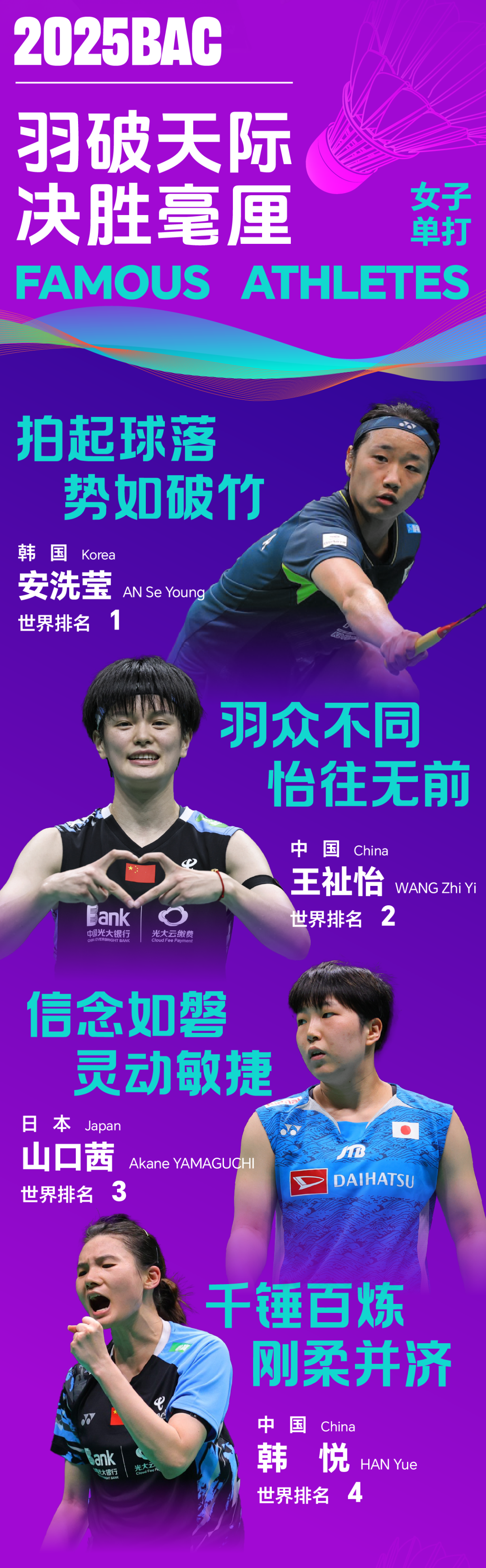 女单赛场,目前世界排名前四的韩国选手安洗莹、中国选手王祉怡、日本选手山口茜和中国选手韩悦都将与观众见面。去年的决赛选手、东京奥运会冠军陈雨菲也将再次向赛事冠军发起冲击。