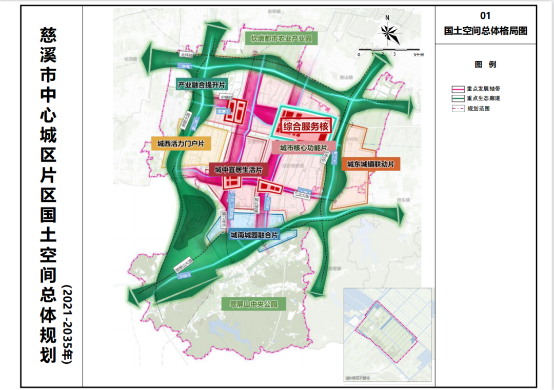 《慈溪市中心城区片区国土空间总体规划(2021—2035年)》规划范围包含5街道(浒山街道、古塘街道、白沙街道、宗汉街道、坎墩街道)与2镇(逍林镇、横河镇),总面积约220平方公里。规划构建“一核引领,轴廊脉动,六片提升,双园融城”的总体空间格局,为慈溪从县域经济向都市经济转型,着力建设长三角现代化区域性中心城市和宁波都市新城区提供支撑力量。