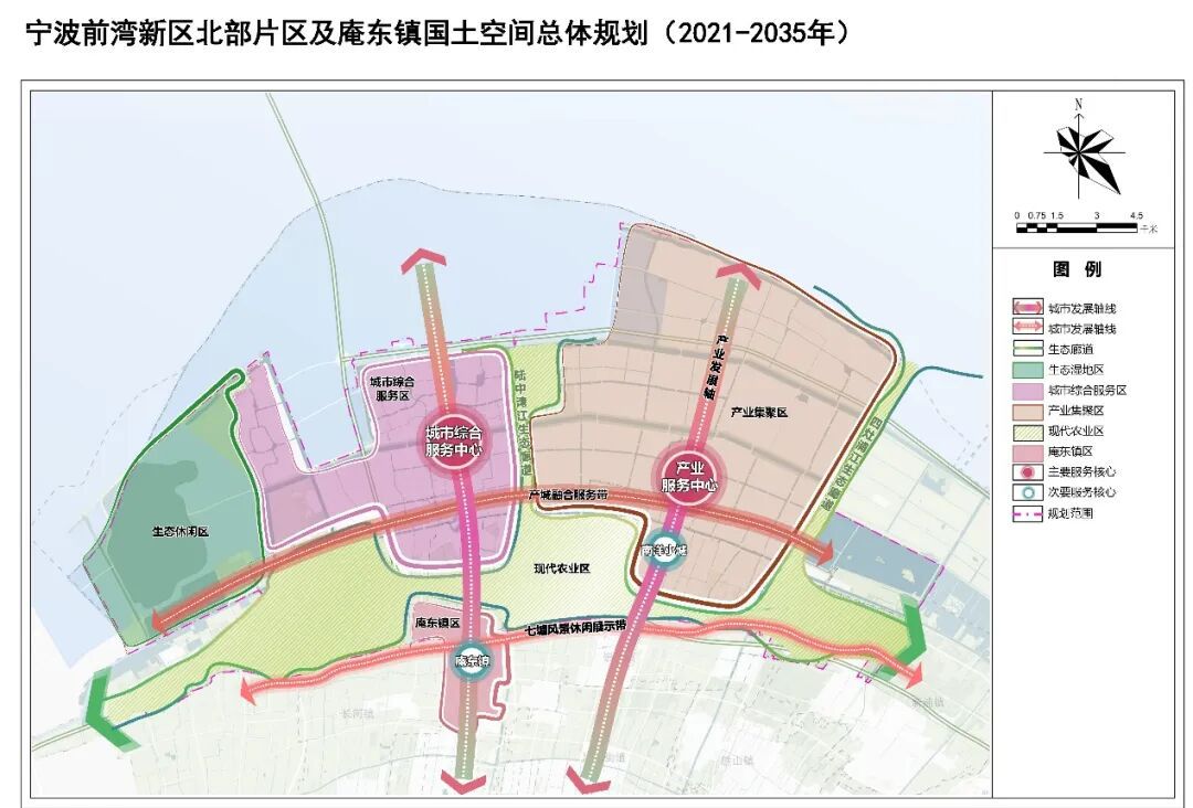 《宁波前湾新区北部片区及庵东镇国土空间总体规划(2021-2035年)》规划范围为宁波前湾新区北部片区及庵东镇行政辖区陆域范围。格局上,规划形成“两带两轴两廊、两心两点、五区联动”空间结构。