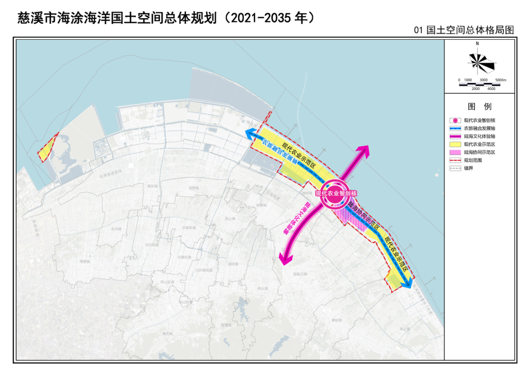 两片区:现代农业示范区和陆海协同示范区。现代农业示范区位于郑家浦东直路以西及秋收路以东,重点推进农业现代化建设、农旅深度融合;在郑家浦东直路与秋收路之间,依托农业硅谷与杭州湾港区联动发展,打造陆海协同示范区。