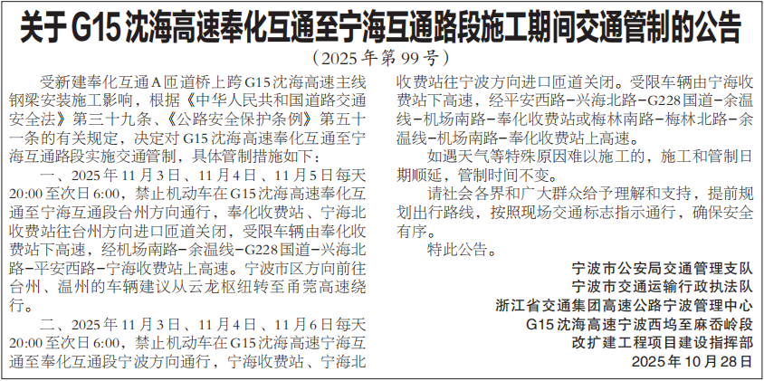 禁止机动车在G15沈海高速宁海互通至奉化互通段宁波方向通行