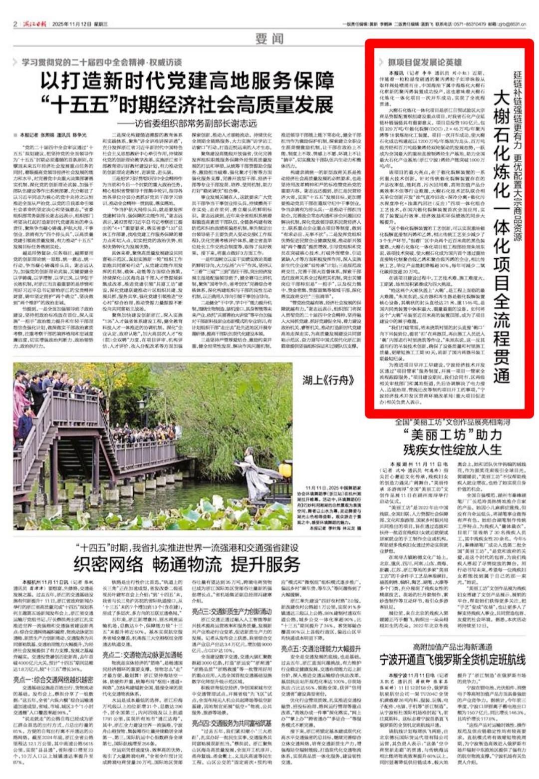 大榭石化炼化一体化项目是浙江自贸试验区大宗商品资源配置枢纽建设重点项目,对我省石化产业延链补链强链具有重要意义。项目总投资193亿元,包括320万吨/年催化裂解(DCC)、2×45万吨/年聚丙烯等18套炼油化工装置。项目一次开车成功,使大榭石化成功构建起以1200万吨/年炼油为龙头、百万吨级芳烃和百万吨级聚烯烃双轮驱动的发展态势,一跃成为全国最大的重油直接制烯烃生产基地,助力全国最大石化产业基地(浙江宁波)烯烃产能突破1000万吨/年。