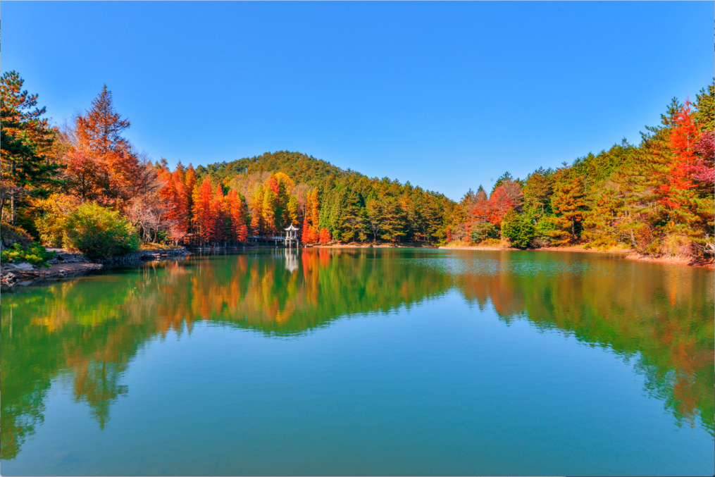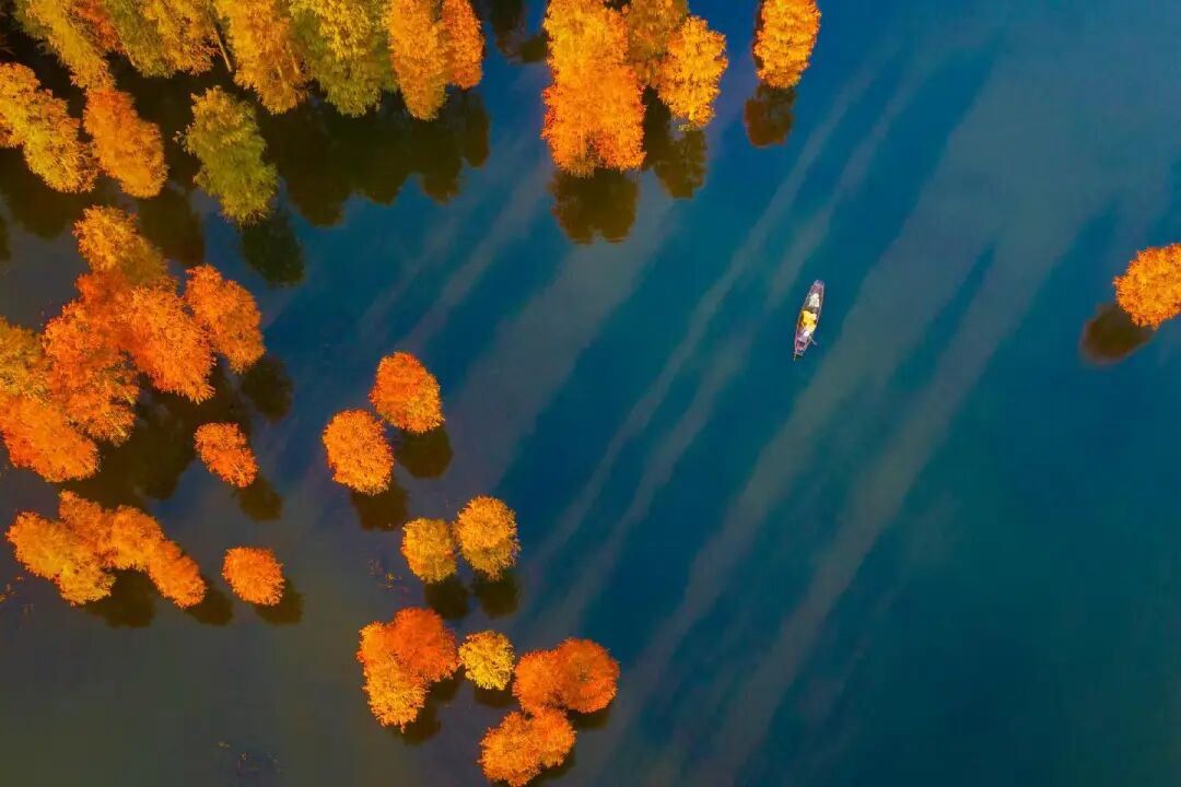 秋季的四明湖,湖水波光粼粼,倒映着岸边的山峦和树木。水杉林静静伫立,树干笔直挺立,自带童话滤镜,像极了绘本里的场景。