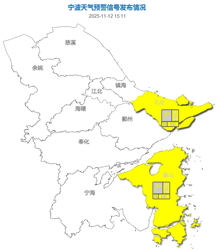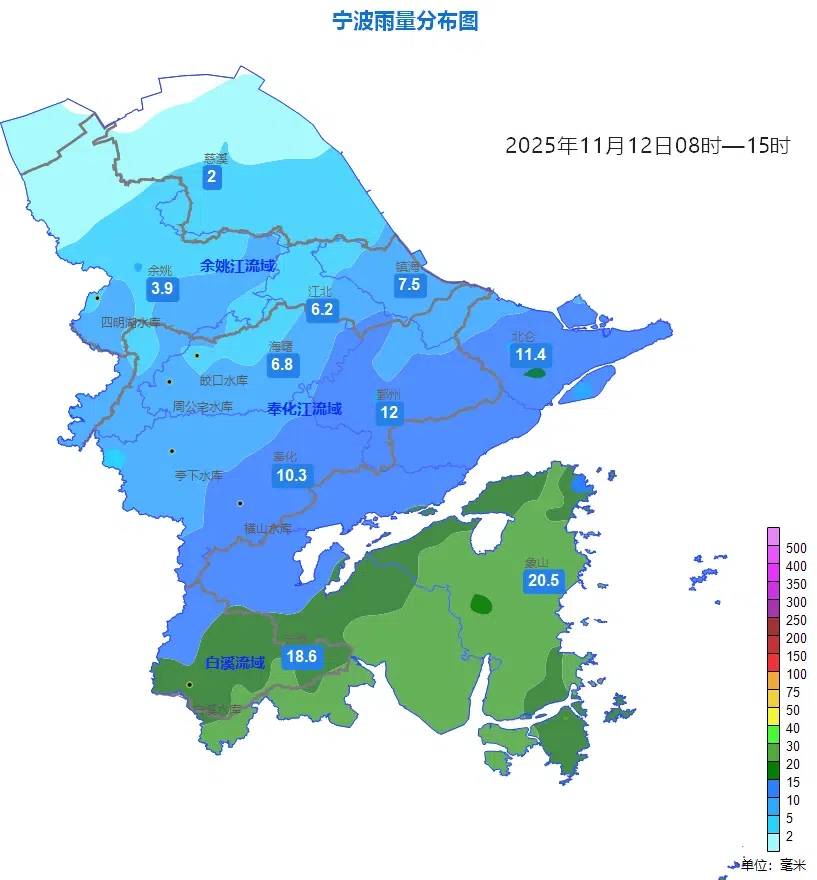 2025年11月12日8时至15时雨量(单位:毫米):全市平均10.3,海曙6.8、江北6.2、镇海7.5、北仑11.4、鄞州12、奉化10.3、余姚3.9、慈溪2、宁海18.6、象山20.5。
