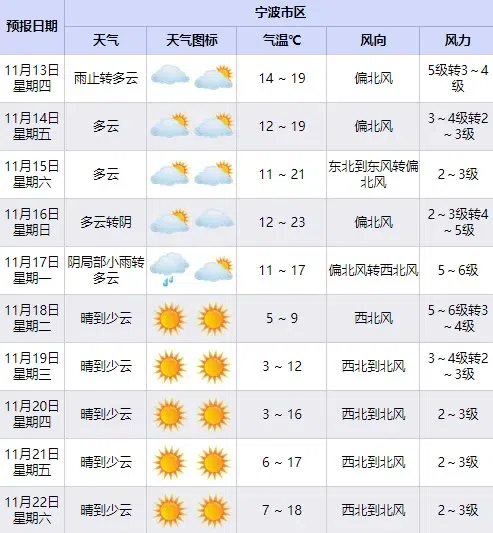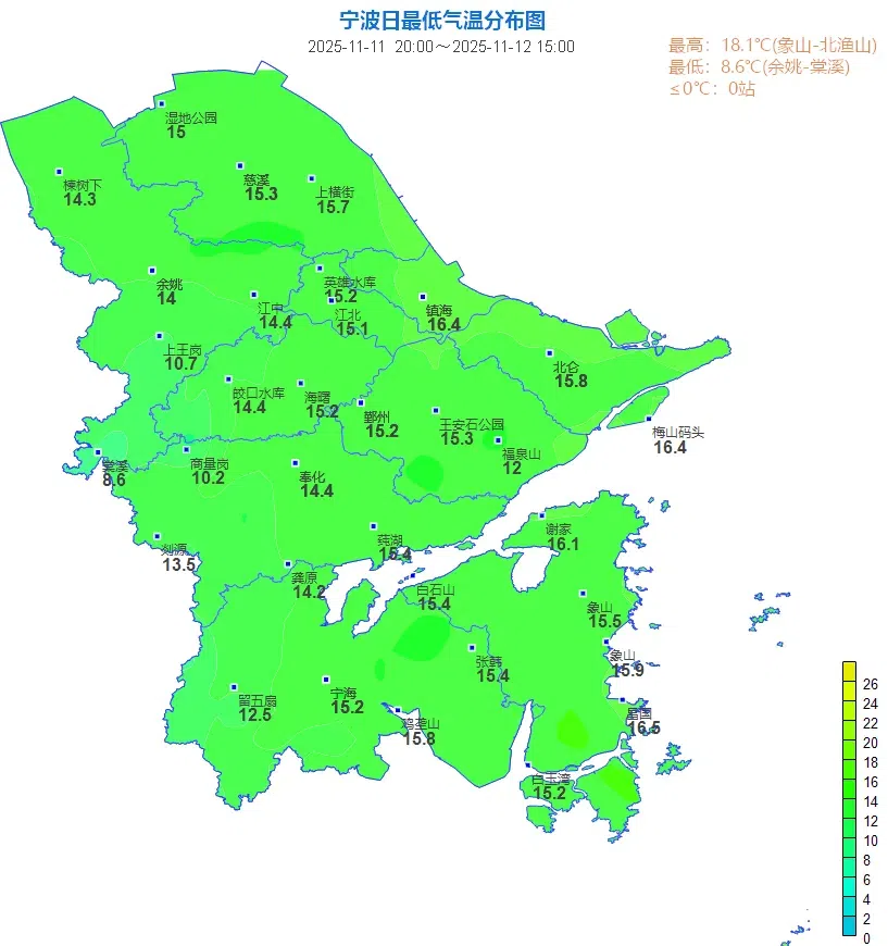 2025年11月11日20时至12日15时,宁波全市代表站气温最低为余姚站14℃。