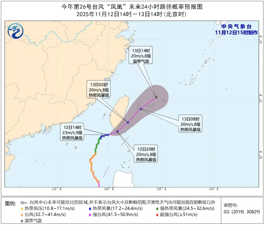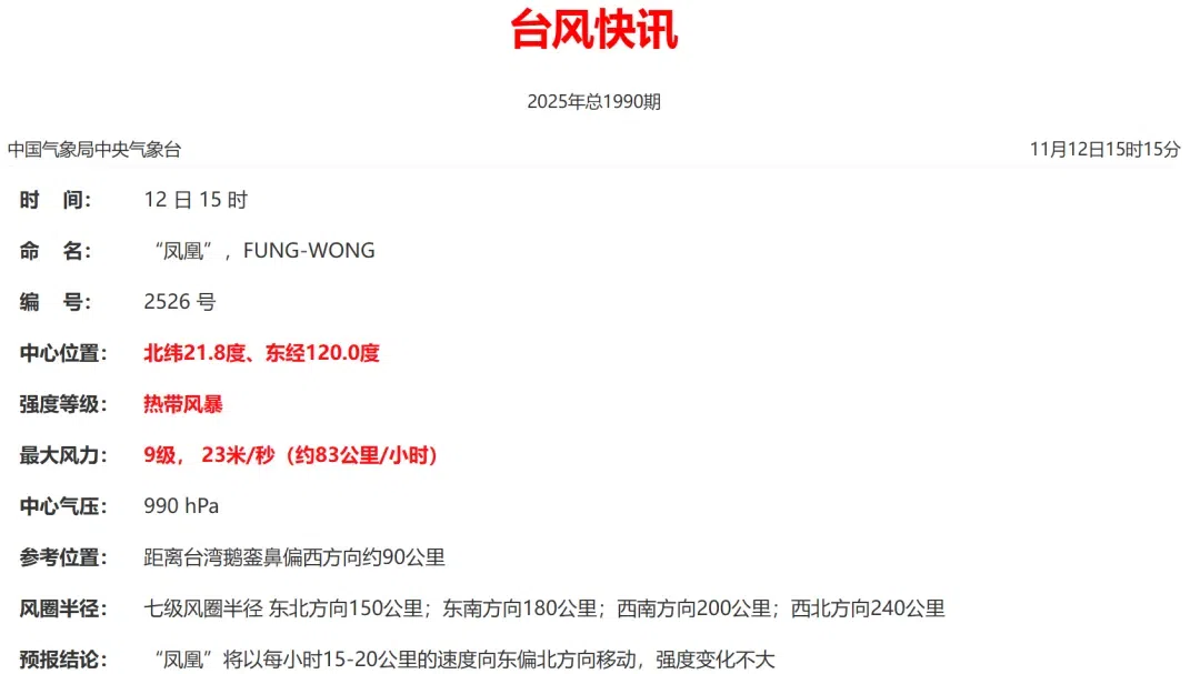 今年第26号台风“凤凰”已于今天(12日)上午减弱为热带风暴级。预计,“凤凰”将以每小时15-20公里的速度向东偏北方向移动,强度变化不大,将于今天傍晚到夜间在台湾岛南部沿海登陆或擦过,尔后逐渐变性为温带气旋。