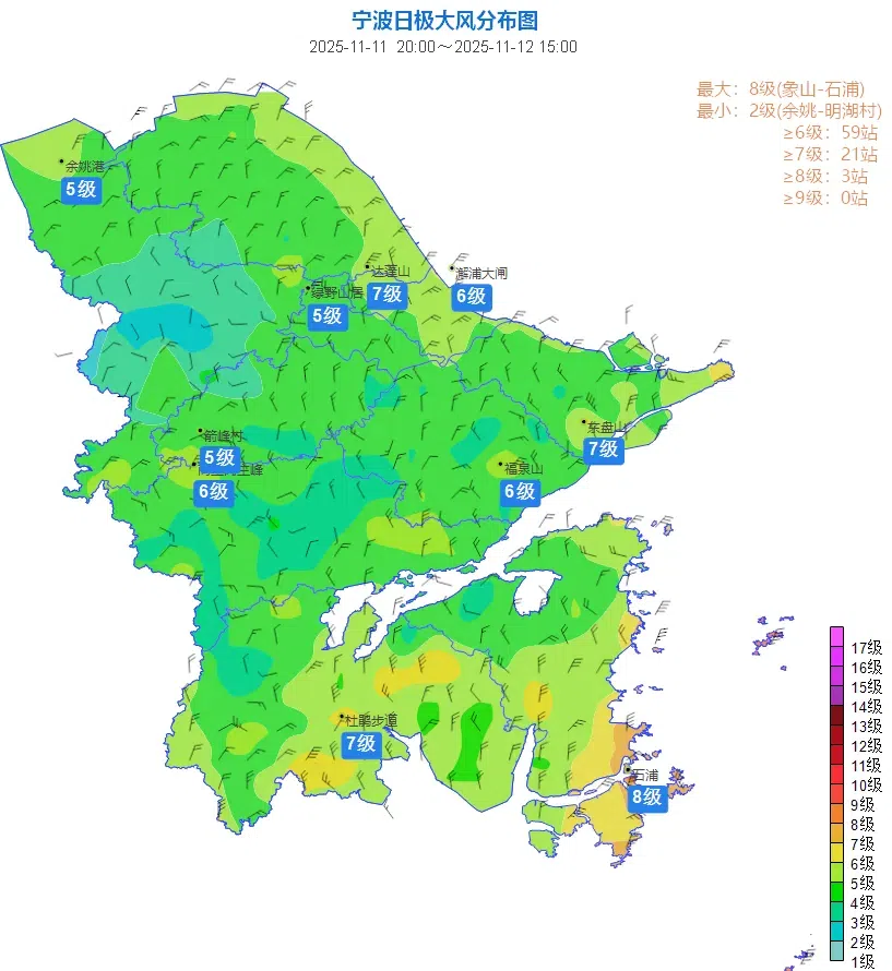 2025年11月11日20时至12日15时,宁波全市日极大风最大测站为象山石浦站(石浦)20.1米/秒(8级,出现时间:11月12日02:58),次大为象山北渔山站(石浦)18.7米/秒(8级,出现时间:11月12日06:57)。