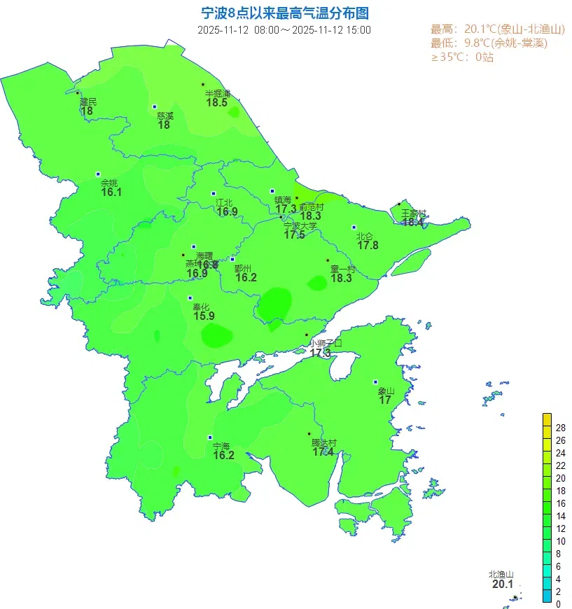 2025年11月12日8时至15时,宁波全市代表站气温最高为慈溪站18℃。