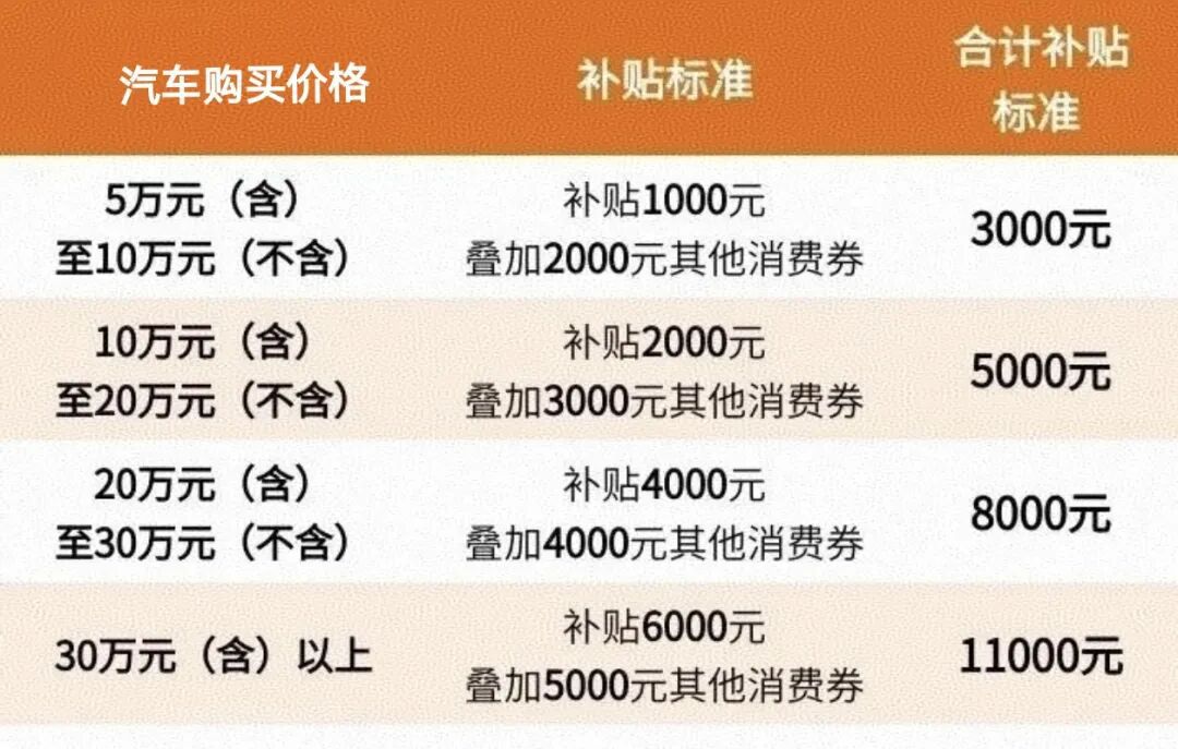 新车发票含税价格在5万元(含)至10万元(不含)之间的补贴1000元,叠加其他消费券2000元;