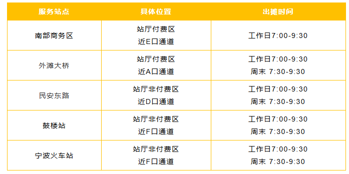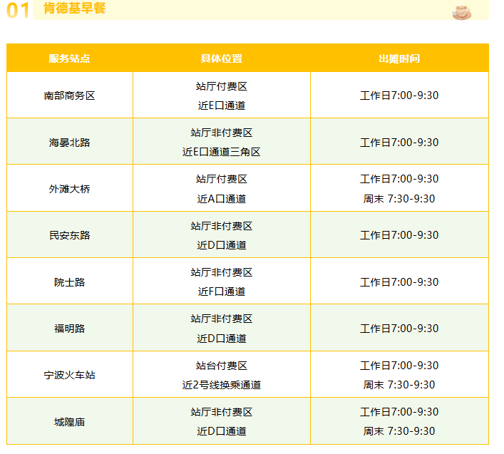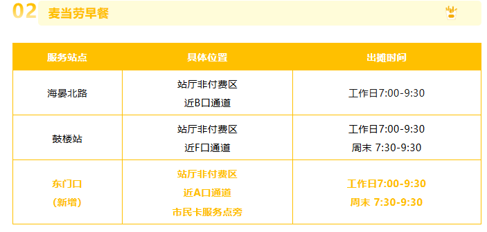 工作日服务时间为7:00-9:30,外滩大桥、宁波火车站、鼓楼站在周末同步开放,服务时间调整为7:30-9:30。精准对接早高峰需求,不用早起排队,地铁站内就能解锁星式美味。