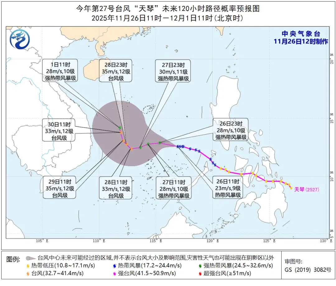 预计,“天琴”将以每小时15-20公里的速度向偏西方向移动,强度逐渐加强,最强可达台风级(33-38米/秒,12-13级),29日以后逐渐转向北偏西方向移动,向南海中西部海面靠近,强度缓慢减弱。