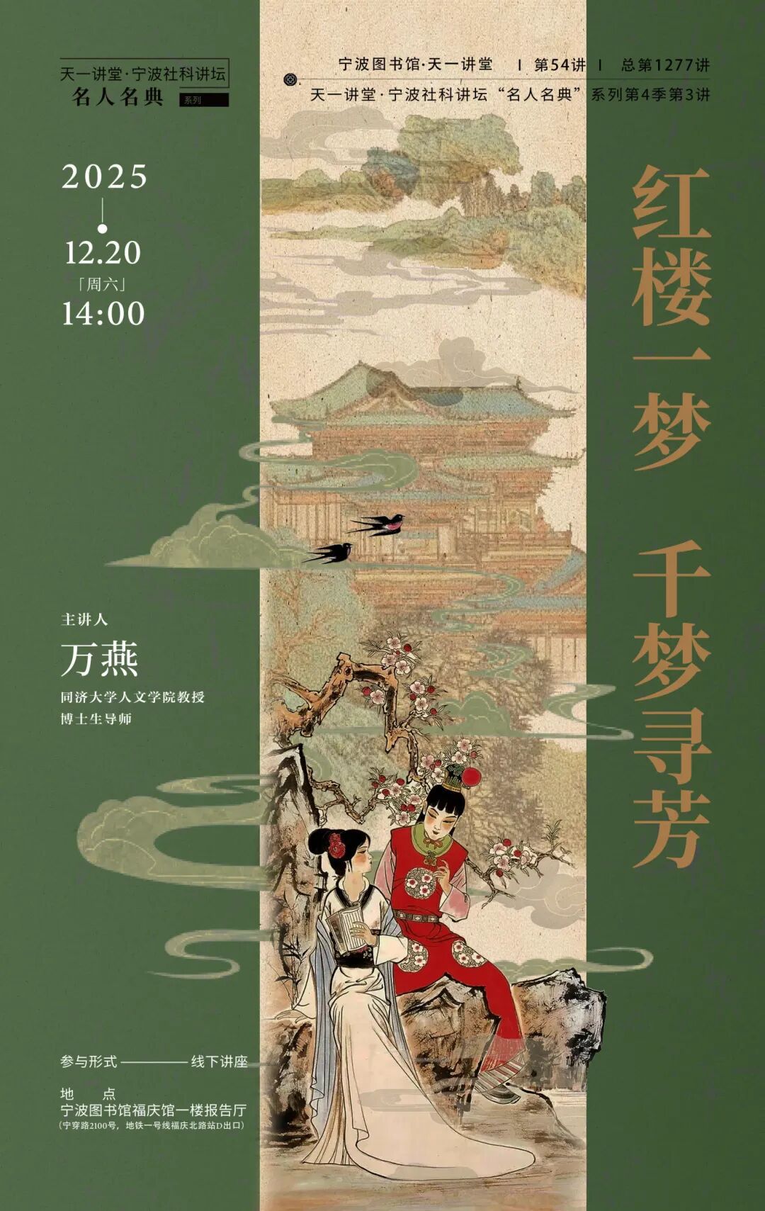 同济大学人文学院教授万燕将做客宁波图书馆,用生动的讲述,与宁波读者一同穿越《红楼梦》的千重梦境,走进名著,品读经典。