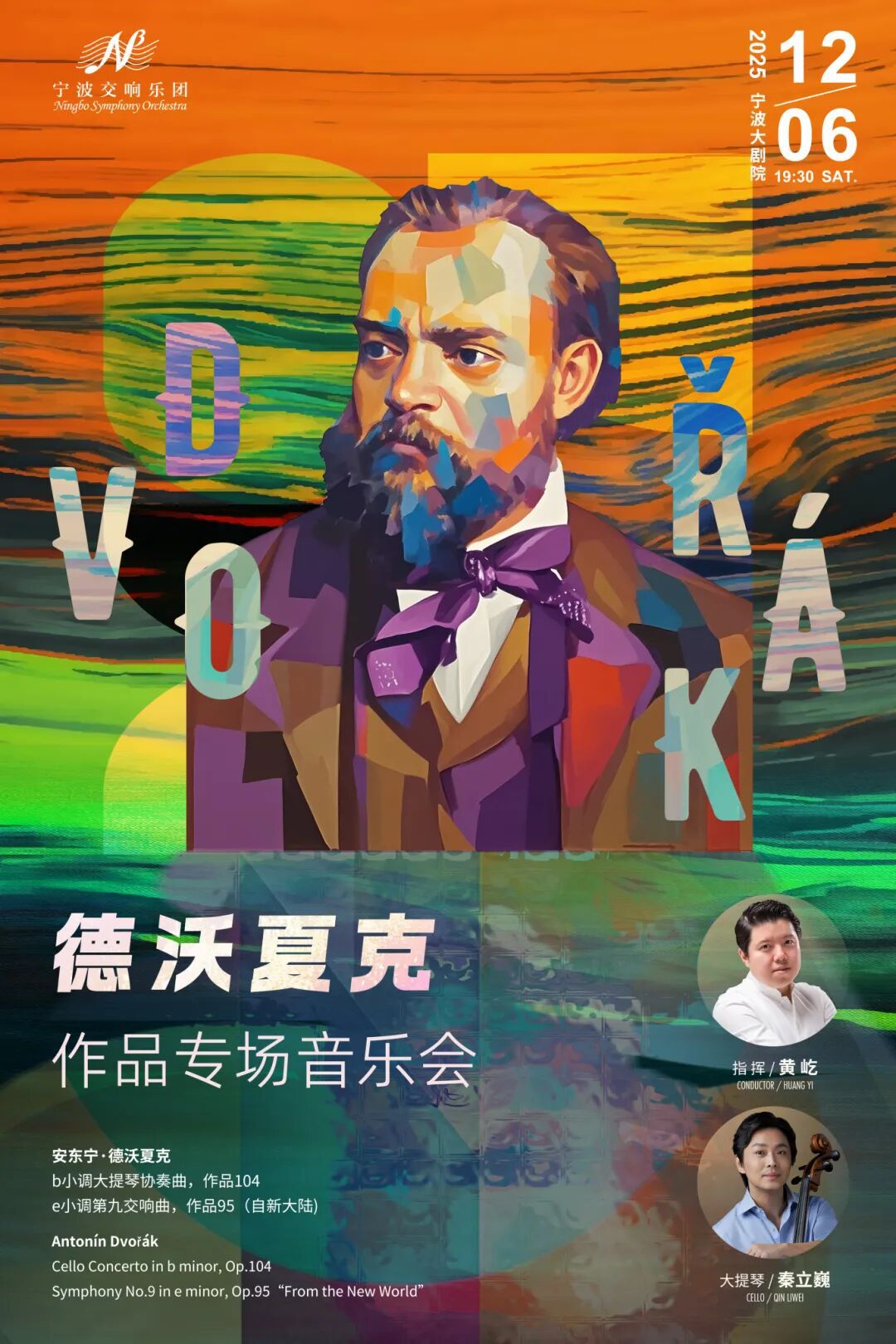 宁波交响乐团携手指挥黄屹、大提琴家秦立巍上演《德沃夏克作品专场音乐会》,演绎《B小调大提琴协奏曲》《E小调第九交响曲“自新大陆”》。