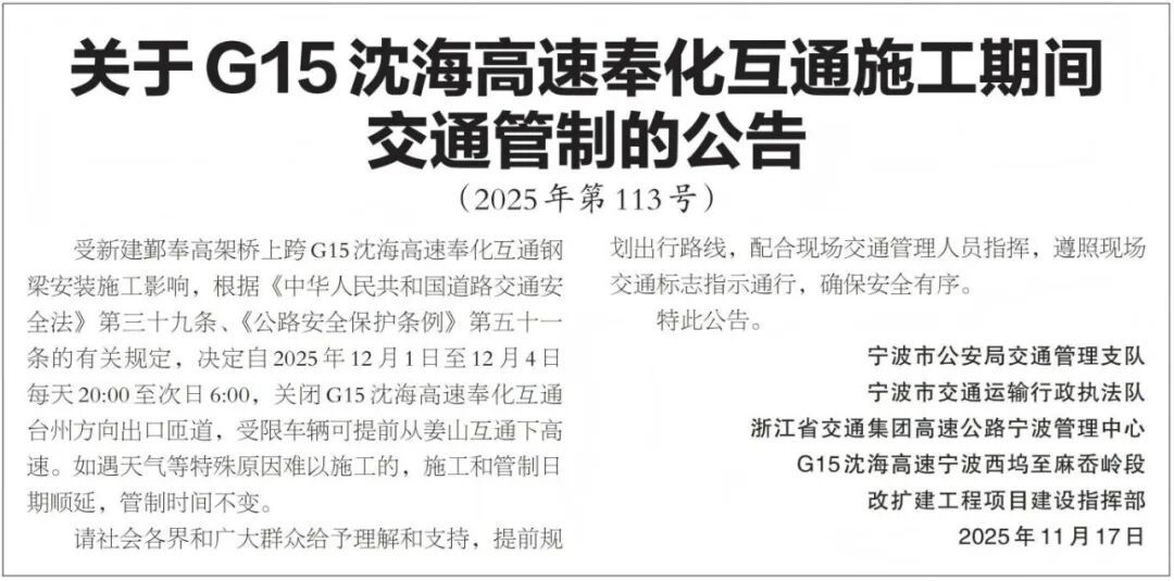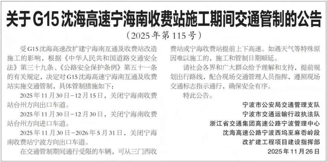 管制路段:关闭宁海南收费站宁波方向出口车道。