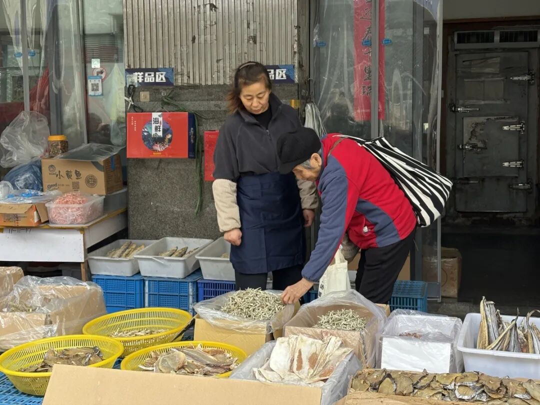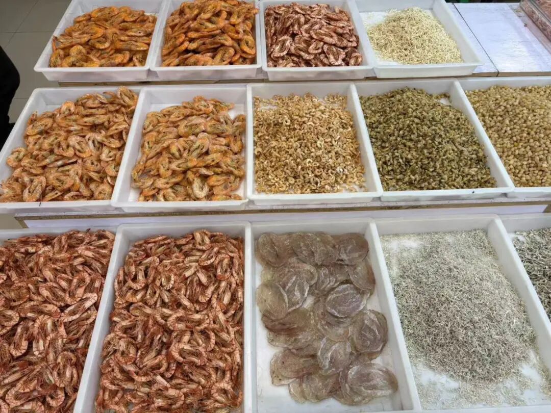 市场内,成堆的虾干、鳗鱼干、黄鱼干在灯光下泛着光泽,咸鲜的海味扑鼻而来。商户们忙碌地称重、装袋,向顾客介绍不同产品的特点。
