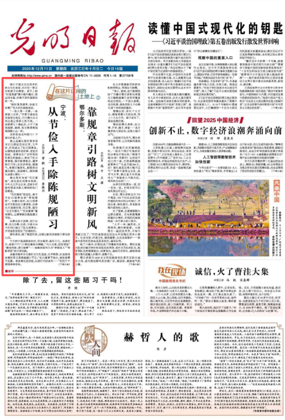 12月11日,《光明日报》头版头条刊发文章《【在这片辽阔的土地上95】宁波:从节俭入手除陈规陋习》,报道了宁波在推进移风易俗过程中,除了因地制宜制定村规民约,还通过家训牌匾、文艺形式等方式让新风尚植根于群众的心田。