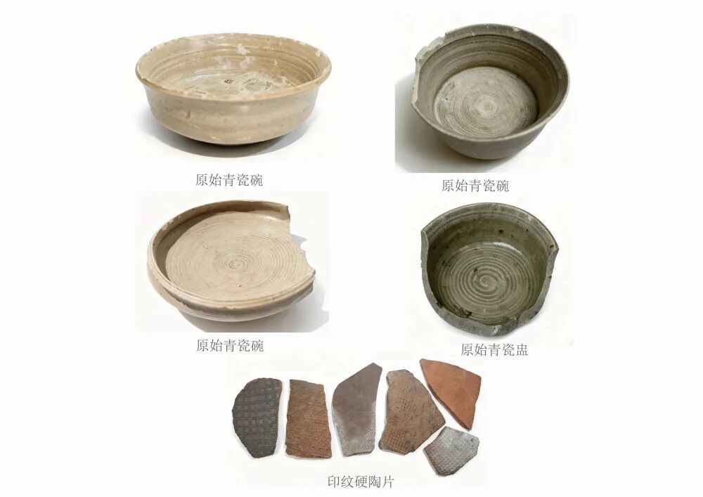 周西遗址东周时期遗存出土典型遗物有原始瓷器、印纹硬陶。原始瓷器是在制陶技术的基础上发展而来的瓷器原始阶段制品,即用含铁量在2%左右的粘土成型后,经过人工施釉,由1200℃左右的高温烧成的青釉制品。此次出土的原始青瓷有明显的轮制留下的蝶旋纹痕迹。