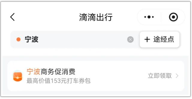 在滴滴App/小程序目的地栏搜“宁波商务促消费” ,即可领取最高价值153元打车券包。领券后打滴滴往返指定点位,首单立享6折。