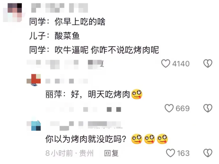 为了回应网友期待,也贴合儿子口味,丽萍直接用行动回应,把早餐局“升级”:火锅、烤肉、糖葫芦配酸菜鱼、苹果午餐肉三明治……这些本该出现在正餐或零食清单里的食物,全被她搬上了早桌,网友们见状戏称其为“雷霆早餐”。