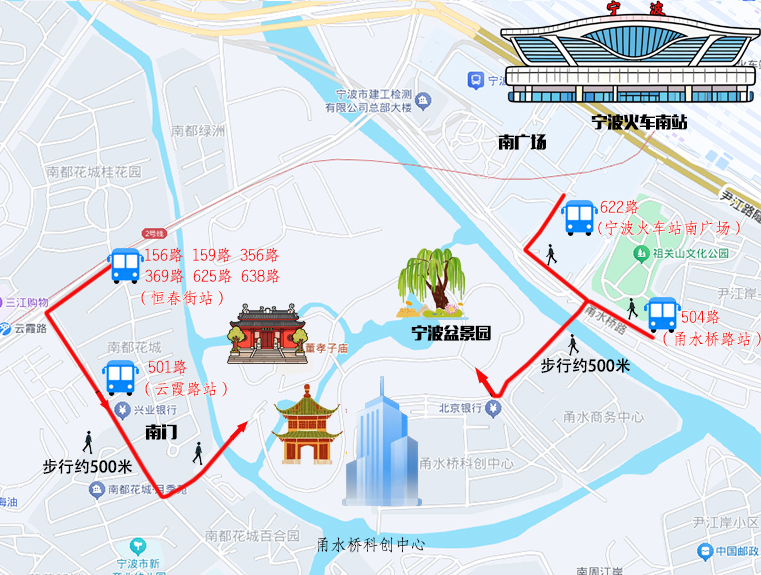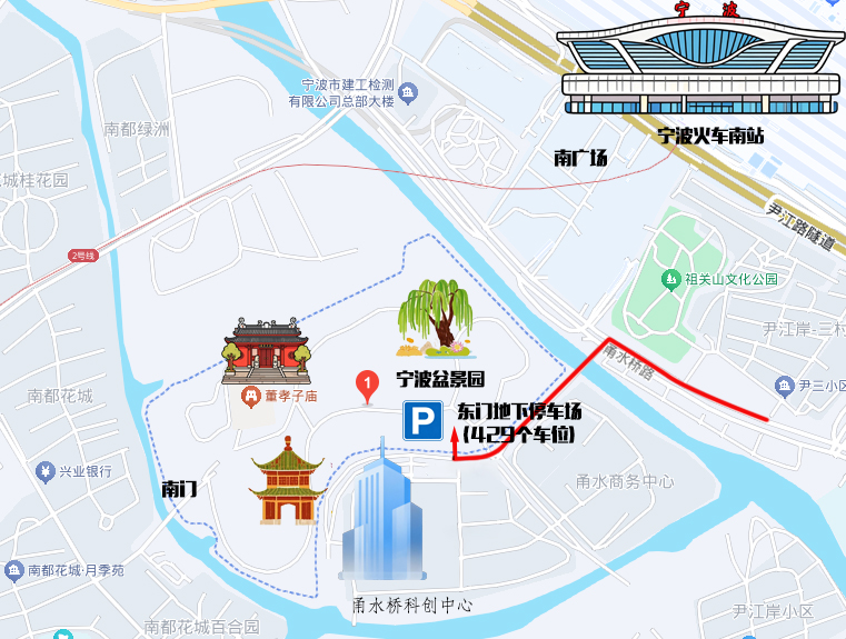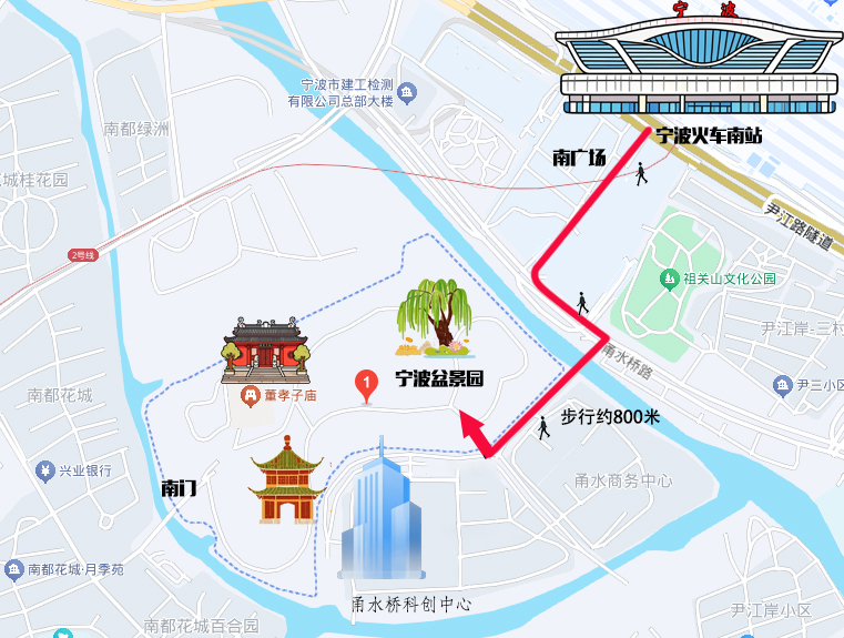 出站指引:从南广场A出口出站→沿甬水桥路向东步行约10分钟。