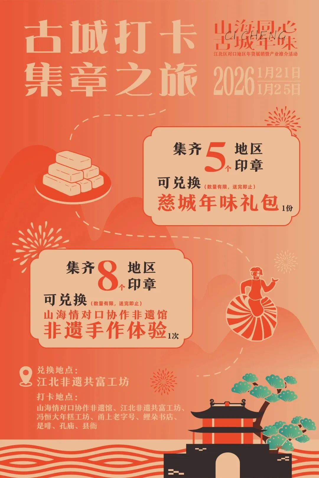1月25日,古城设置8个打卡点,集章可兑换好礼。