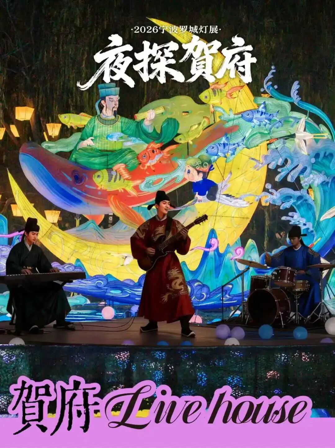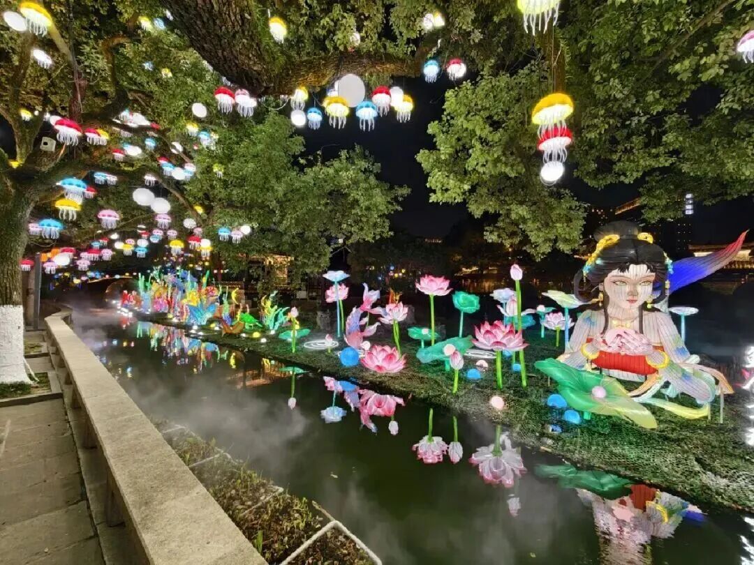 月湖公园的30余组特色灯景划分出六大主题板块,将古韵揉进流光溢彩的灯影里。主办方打造的“夜探贺府”沉浸式综艺秀也在此开展。