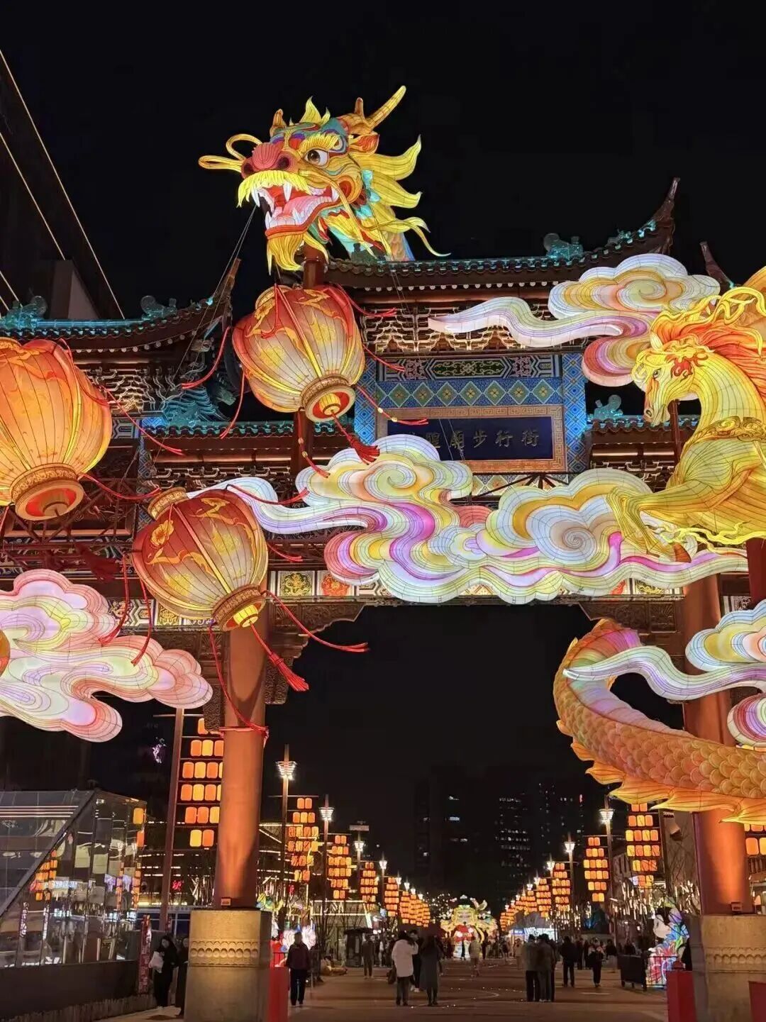 城隍庙街区的14组主题灯景,将古牌楼与步行街晕染得流光溢彩。