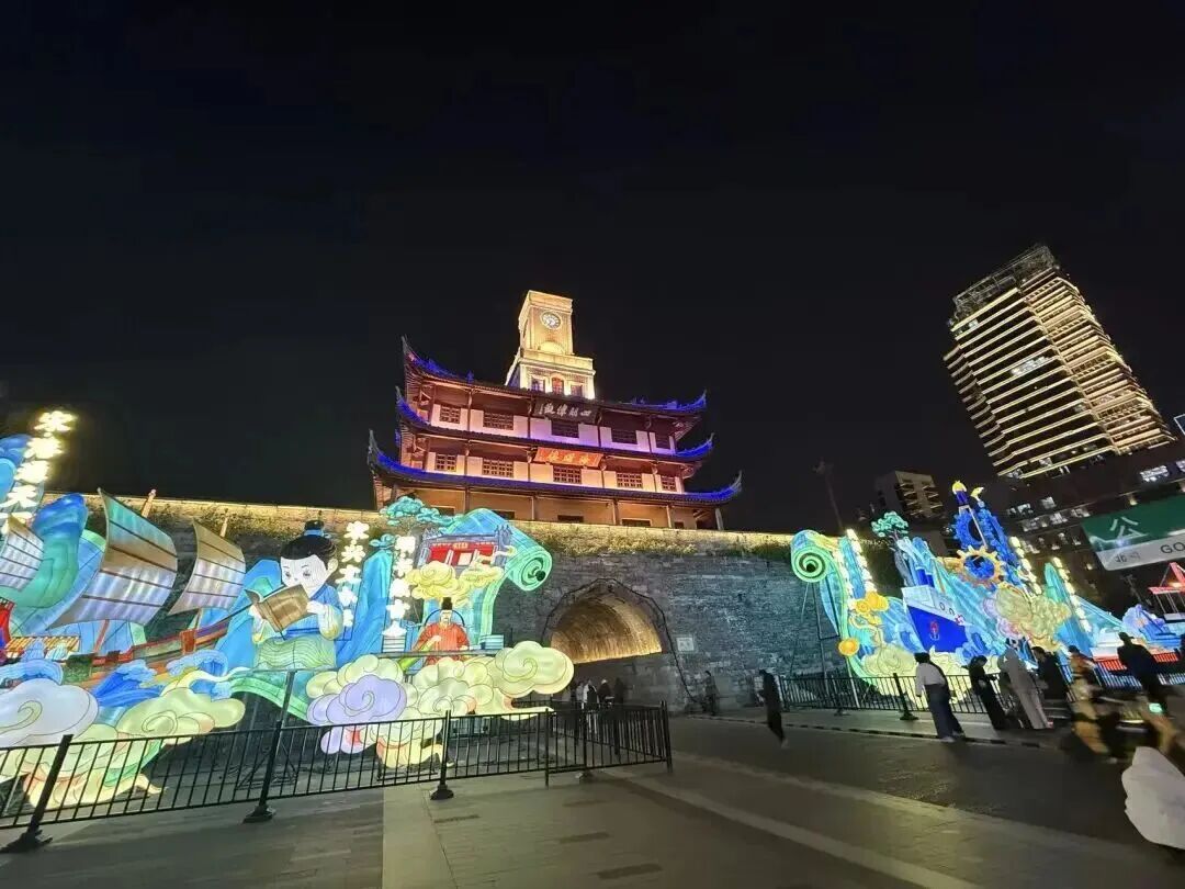 鼓楼的18米动态光影长卷,徐徐展开罗城千年变迁;望京门“马到成功”的灯组,寄托着新年顺遂的美好期许。