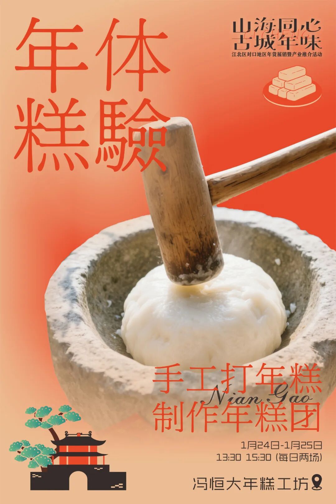 1月25日13:30、15:30,在古城亲手制作慈城年糕,感受非遗技艺的温度。