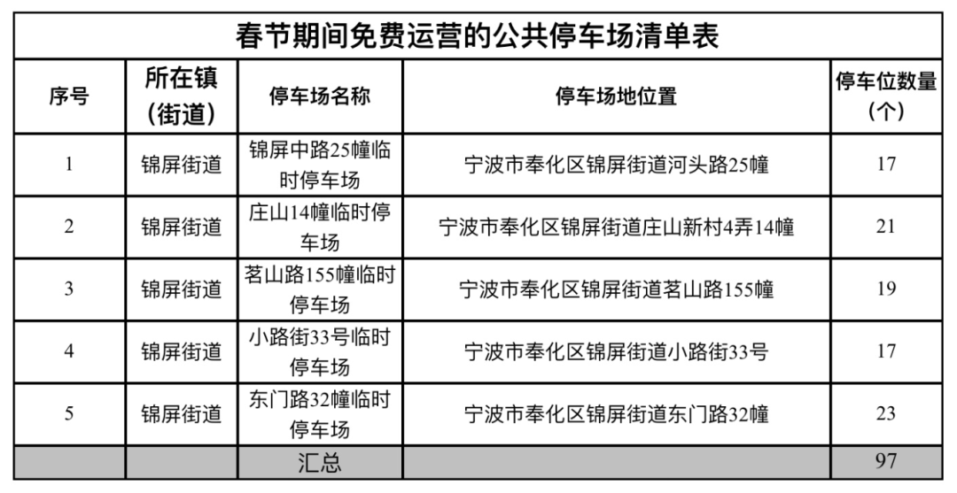 为营造喜庆祥和的节日氛围,保障春节期间广大市民群众停车便利,创造平安有序的交通环境,春节期间,全区城市道路路内收费泊位及部分老旧小区周边公共停车场(详见下方表格)将实行免费停放,免费时间为2026年2月14日17:30至2026年2月24日8:00。