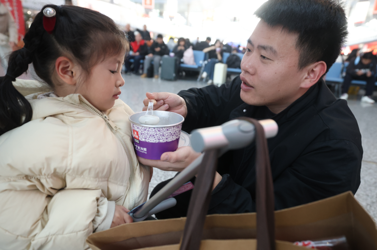 一位父亲正在喂女儿吃汤圆。陈结生 摄