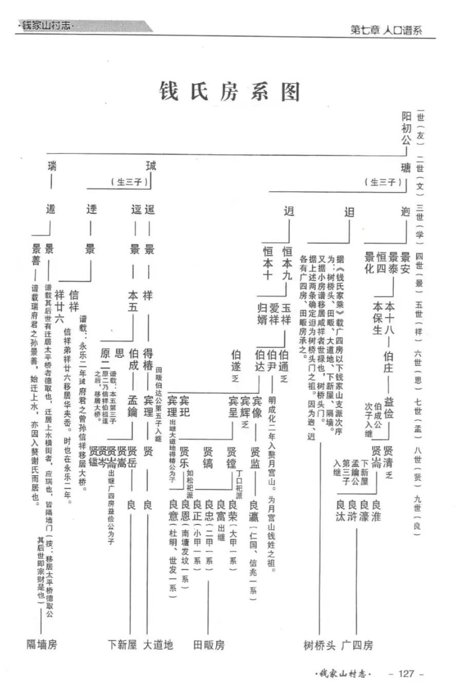 图为《钱家山村志》记载钱氏房系图。