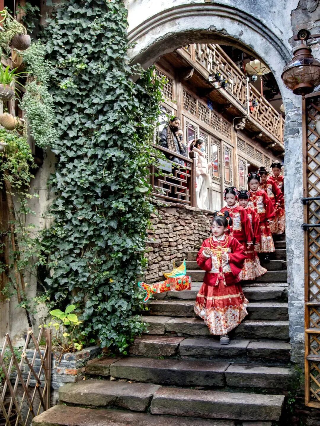 在奉化雪窦山景区,“紫禁城里过大年”展览以数字投影技术重现清代宫廷年俗,MR混合现实技术让游客在登山途中“偶遇”宫廷仪仗,通过手机屏幕即可与虚拟角色互动合影,实现一步一景、移步换景的沉浸式游览。鄞州文化馆开设“马‘尚’有趣”非遗手作课程,引领市民亲手体验宋锦拼布、掐丝珐琅、青花拼贴等传统技艺,于创造中感受美学年味。象山石浦推出沉浸式新春盛会,开展戚家军情景剧、非遗鱼灯舞等特色巡游及国潮戏曲展演。宁海前童古镇的汉服秀与民俗互动,让游客身着华服体验古代游艺。慈城古县城的马年灯会以“文星耀慈城·福运喜迎春”为主题,结合非遗花灯与光影科技,首创千米城墙灯会模式。