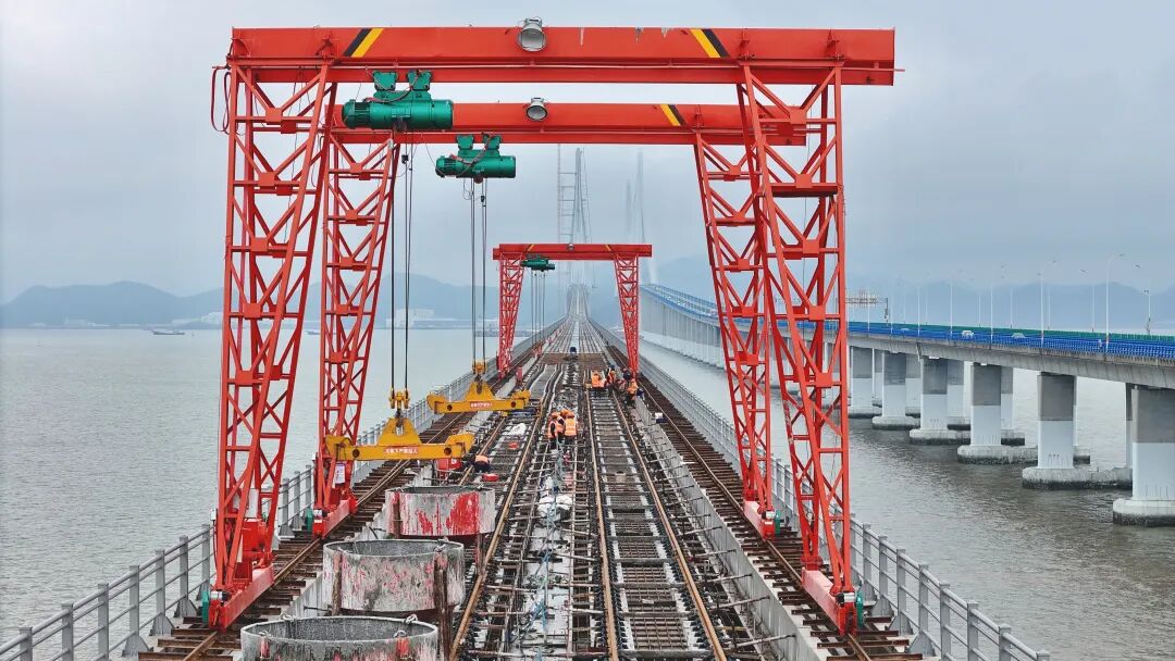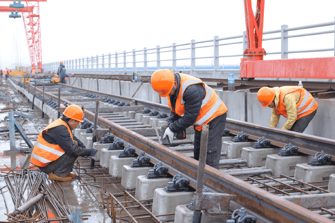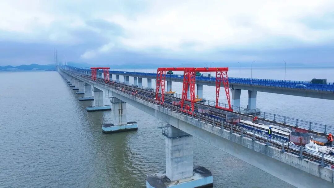 为确保市域铁路象山港跨海大桥铺轨施工高效推进,春节期间约有120名工人坚守岗位,同步推进大桥北岸引桥无砟轨道铺设与主桥预压作业,完成铺轨800米,后续将加快主桥铺设进度,全力冲刺象山线“轨通”目标。