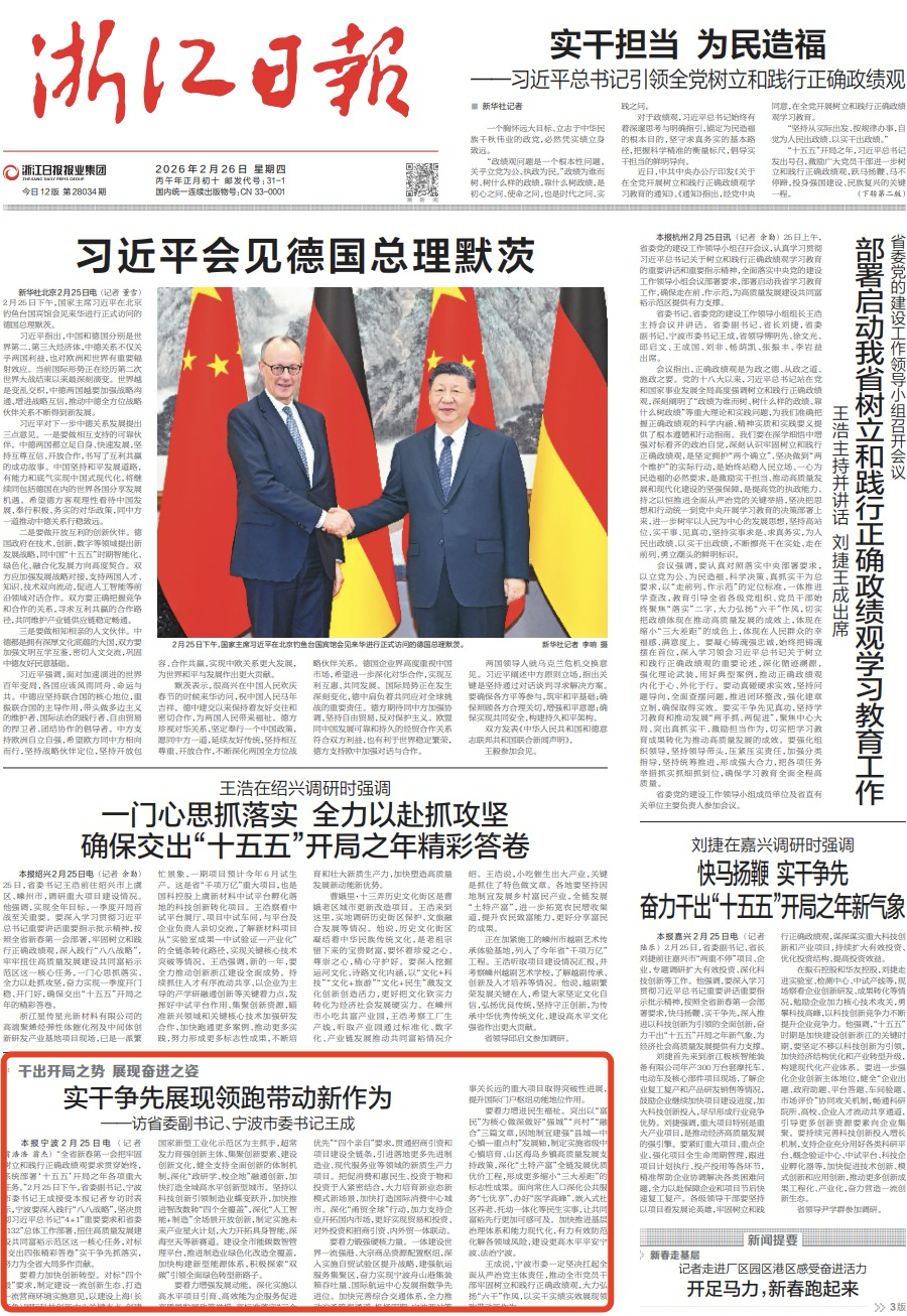 同日,《浙江日报》头版刊发文章《实干争先展现领跑带动新作为——访省委副书记、宁波市委书记王成》。