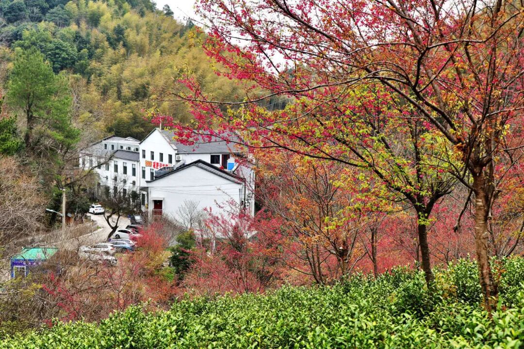 鄞州柯青家庭农场樱花点缀茶山。