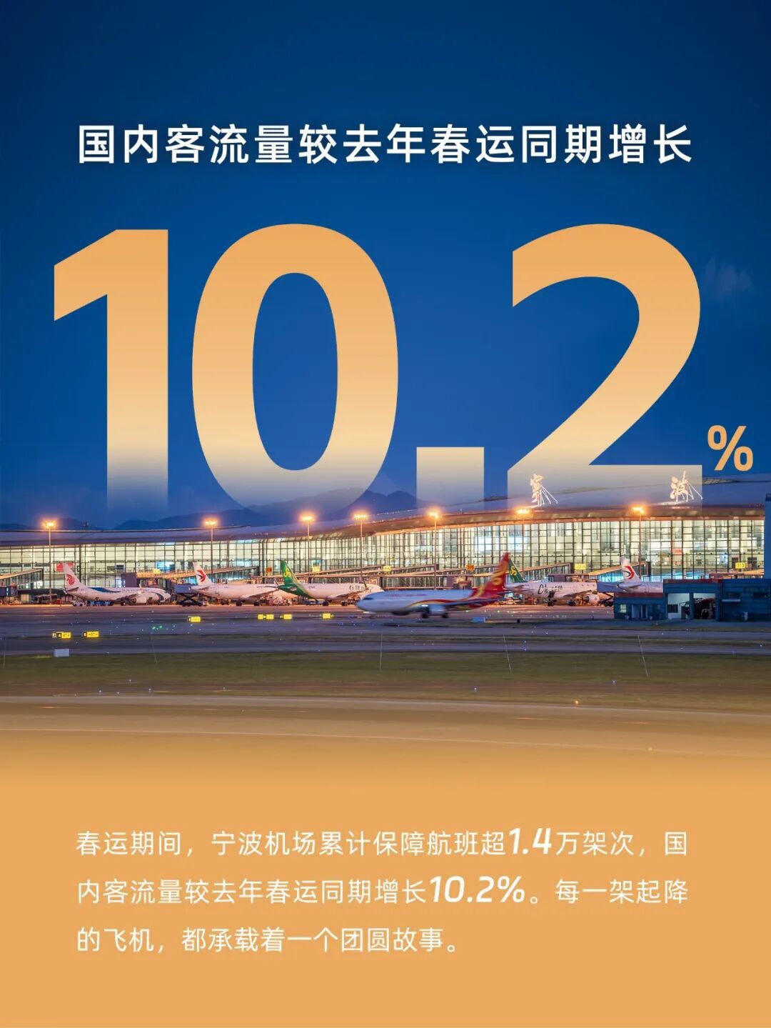 春运期间宁波机场累计保障航班超1.4万架次,每一架起降的飞机,都承载着一个团圆故事。