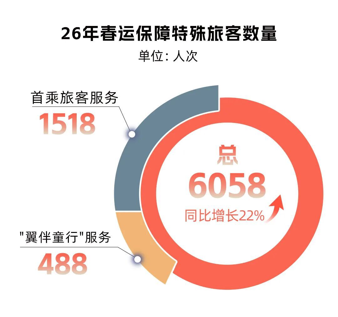 春运期间,共保障特殊旅客6058人次,同比增长22%。其中服务首乘旅客1518人次,“翼伴童行”服务儿童488人次,升级 “乐航银龄” 适老化服务,增设 “银龄百宝箱”,织密老年旅客出行保障网。