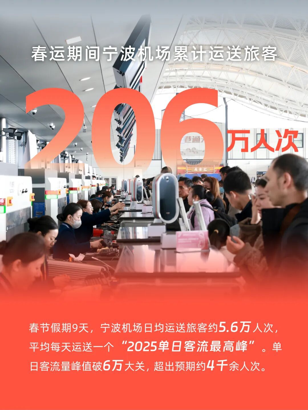 春运40天,宁波机场累计运送旅客206万人次,日均近5.2万人次,同比增长9.1%,206万人次的选择,是宁波城市活力的最好注脚。