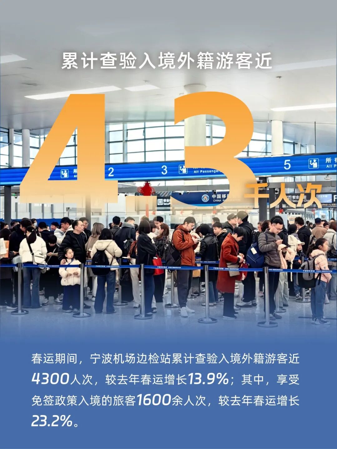 越来越多外籍游客通过宁波机场走进浙江、感知中国。春运期间,宁波机场边检站累计查验入境外籍游客近4300人次,较去年春运增长13.9%;其中,享受免签政策入境的旅客1600余人次,较去年春运增长23.2%。