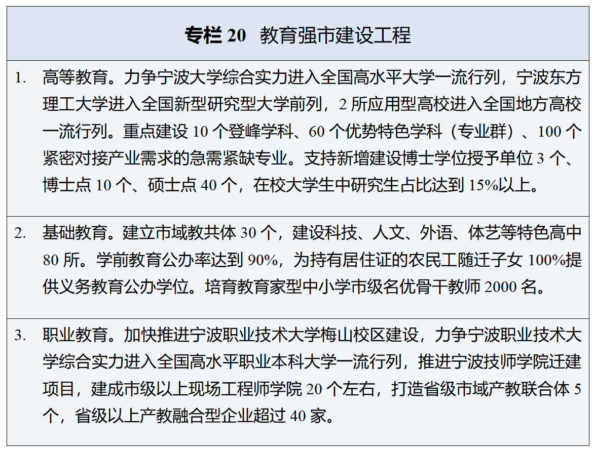 推动高等教育提质创优。健全高校高质量发展评价机制,分类支持高水平大学建设,提升高校办学治校水平。推动宁波大学高质量建设“双一流”高校,支持宁波东方理工大学建设新型研究型大学、宁波诺丁汉大学建设高水平中外合作大学,推动应用型高校错位协同发展,鼓励国外高水平理工类大学来甬合作办学。深入实施高校学科专业“161”工程,推动高校学科专业布局调整,建强基础学科,发展交叉学科。有序增加优质本科教育和研究生培养规模,深化高校研究生培养模式改革。