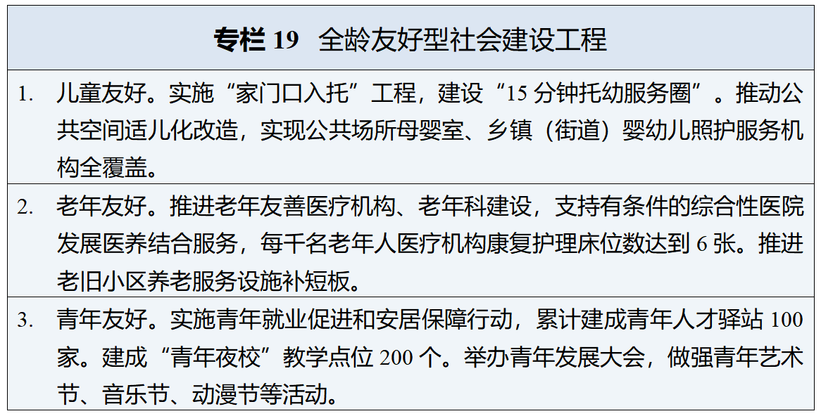 完善养老服务体系。加快健全城乡养老服务网络,大力发展普惠支持型养老机构,优化居家为基础、社区为依托、机构为专业支撑、医养相结合的养老服务供给格局。推进公办养老机构国企化改革,支持民办养老机构发展,推动基层医疗机构提供医养结合服务。推进家庭、社区、公共空间适老化改造,加强智能设备在养老场景集成应用,构建“家门口”幸福养老体系。健全失能失智老年人照护体系,加大养老服务技能人才培养力度,养老机构护理型床位占比达到75%以上。积极开发老年人力资源,稳妥实施渐进式延迟法定退休年龄,优化就业、社保等方面年龄限制政策,发展多层次多领域老年教育,深入开展新时代“银龄行动”。大力发展银发经济,扩大康养旅居、康复护理、安宁疗护等服务供给,谋划建设银发经济产业园。