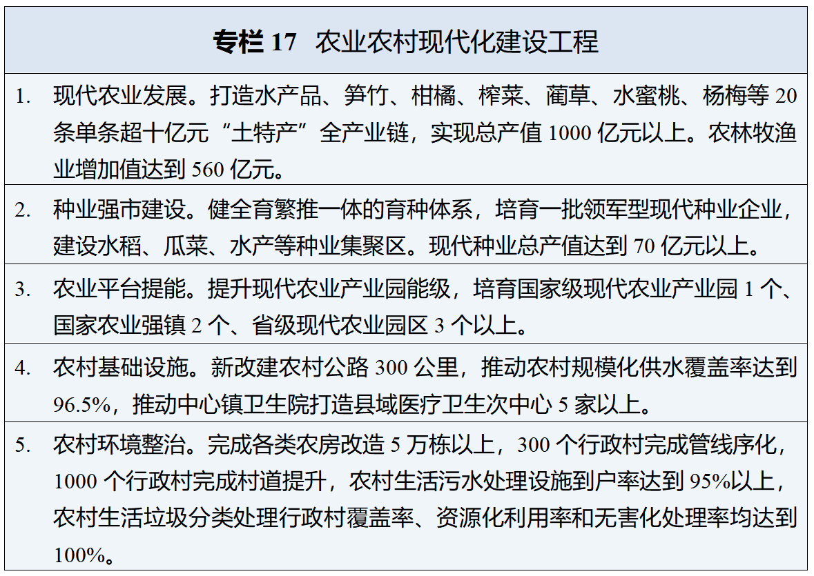 大力发展现代农业。统筹发展科技农业、绿色农业、质量农业、品牌农业,提升农业综合生产能力和质量效益。深入实施“藏粮于地、藏粮于技”战略,强化耕地保护和质量提升,高质量推进高标准农田建设,优化农用地空间布局,健全种粮农民收益保障机制,确保粮食播种面积172万亩以上。推动“土特产富”全链发展,做强农产品加工流通业,引育一批农业链主企业,高标准建设现代农业园区,积极推广特色地理标志品牌农产品,打造一批标志性全产业链。大力发展设施种植、设施畜牧和设施渔业。强化农业科技支撑,加大农业生物技术、农产品安全和智慧农业领域技术攻关。加快推进种业强市建设,加大核心种源保护利用和技术研发力度,打造现代种业品牌矩阵。加快农业领域设施设备更新,优化提升现代农事服务中心功能。