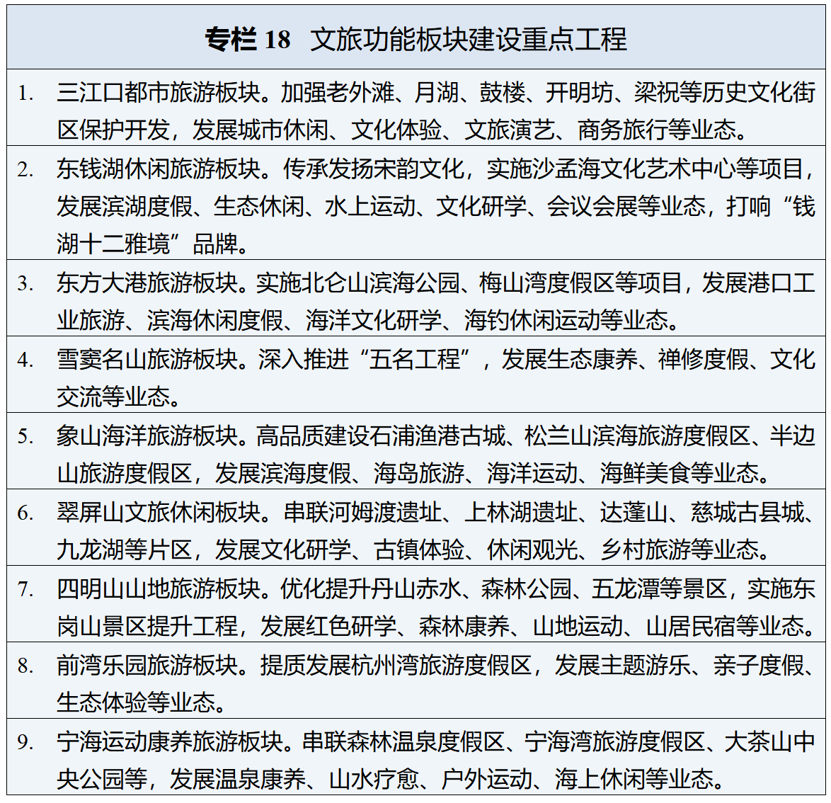 构建全域旅游空间格局。依托“枕山、拥江、揽湖、滨海”禀赋优势,建设全域大景区体系。深化浙东唐诗之路、大运河诗路文化带建设,加快打造三江口都市旅游、象山海洋旅游、东钱湖休闲旅游、四明山山地旅游、前湾乐园旅游等重点板块。全面提升天一阁·月湖景区、溪口—滕头旅游景区、东钱湖国家级旅游度假区等服务水平,支持慈城古县城等创建国家5A级旅游景区,推动松兰山滨海旅游度假区、宁海森林温泉旅游度假区、杭州湾旅游度假区等创建国家级旅游度假区。加快旅游景区转型提质,培育建设一批商务观光、运动康养、休闲度假、文博研学、民俗体验等新业态景区。提升景区市场化运营水平,培育壮大文旅市场经营主体。推进“乡旅共富路”品牌建设,提升民宿经济发展水平,培育一批全国乡村旅游重点村镇。