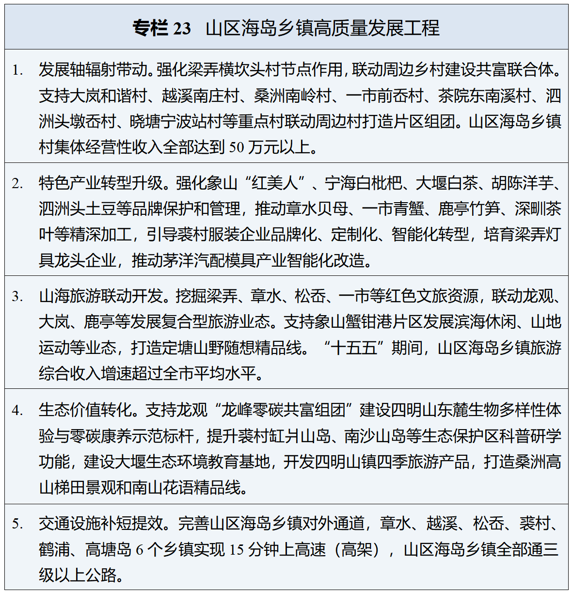加快山区海岛乡镇高质量发展。立足资源禀赋、经济基础、区位条件,着力优产业、优民生、优生态,推动形成以强带弱、功能互补、组团共进的山区海岛发展新格局。统筹推进区域生态资源保护和开发,推动公益性与经营性项目整体规划、一体实施,发展特色旅游产业,共建区域品牌体系,实现生态效益与经济效益相统一。提升区域道路交通、公共服务设施水平,提高基本公共服务质效。完善山区海岛高质量发展支持政策,“一镇(乡)一方案”引导错位发展、特色提升,探索推进经济强镇与山区海岛乡镇结对帮扶。